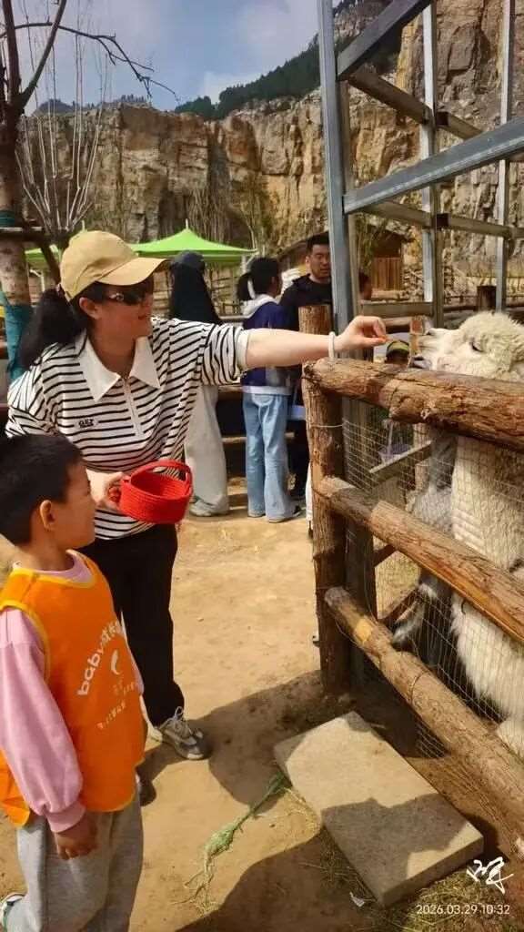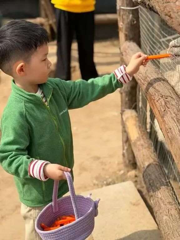 告别植树场地,大家来到萌宠乐园,开启了一场超治愈的萌宠互动之旅。羊驼温顺地低下头,等着宝贝们投喂胡萝卜,软乎乎的模样让大家忍不住连连惊叹;还有可爱的小动物们,在围栏里探头探脑,宝贝们提着装满胡萝卜的小篮子,小心翼翼地伸出小手,眼神里满是温柔与欢喜。