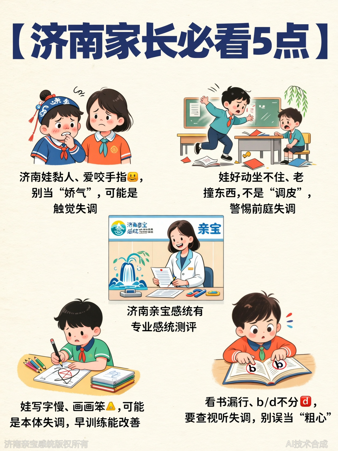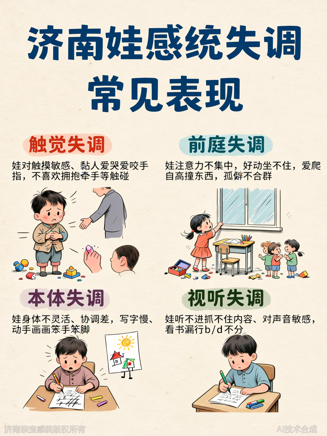 孩子坐不住、爱啃指甲、怕接触陌生人?这些可能是感统失调的信号。本文结合济南本地情况,详解感统失调常见症状,帮家长早识别早干预。